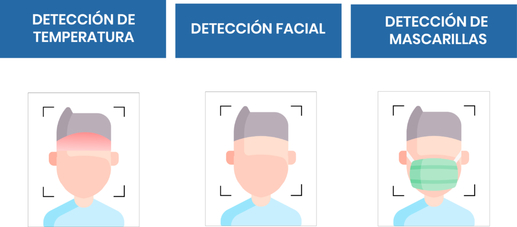 - Reconocimiento facial: Mide la temperatura corporal y detecta si el usuario lleva mascarilla